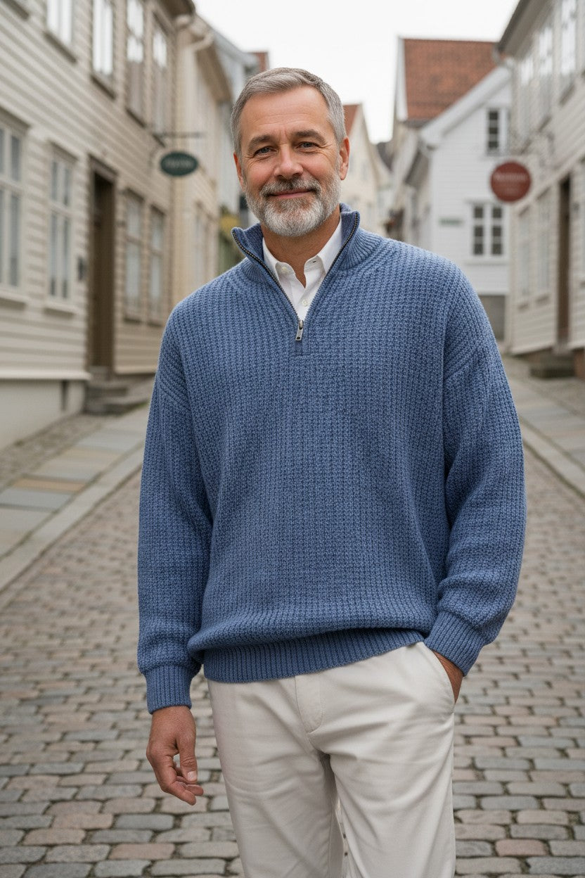 Julius skiller seg ut med sin elegante ribbet tekstur som gir både komfort og karakter. Den lange ermen gjør den perfekt for norske forhold. Et stilsikkert valg for voksne menn.